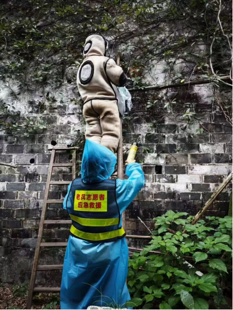 考虑到马蜂在黄昏时段活动相对平缓,且此时处置能最大限度减少对居民日常出行的影响,社区联合老兵救援队共同制定处置方案。他们第一时间到达现场,对周边环境进行勘察,确认马蜂窝位于墙体高处的藤萝缝隙中,蜂巢周围不时有马蜂进出。为避免处置过程中马蜂扩散伤及过往居民,社区工作人员在现场设置警戒区域,引导周边居民暂时避让。随后,有除蜂经验的两名老兵救援队员身着防蜂服,一边清理蜂巢周边的藤萝,一边要求其他人员到安全位置,随后,对准蜂巢迅速喷洒杀虫剂,待马蜂活动减弱后,果断将蜂巢完整摘除,并装入编织袋密封处理。整个处置过程紧张有序、动作娴熟,仅用半小时便完成了蜂巢清除工作。