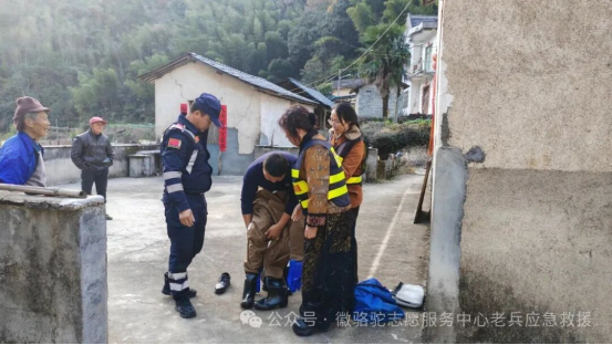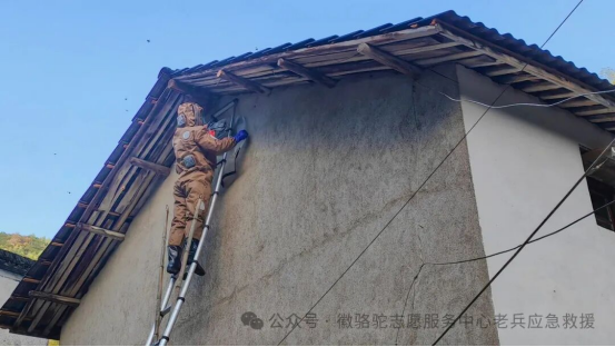 近日,休宁县老兵志愿者应急救援队接到齐云山镇龙源村酸梅树一村民求助。自家房屋外墙有一大型马蜂窝,蜂群活动频繁,严重危及村民安全。接报后,5名救援队员携带装备迅速出动。