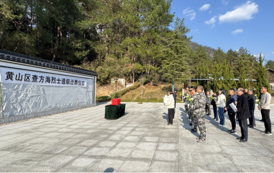 12月19日,黄山区隆重举行仪式,迁葬当地零散烈士墓查方海烈士遗骸,安葬黄山烈士陵园。区退役军人事务局,相关主管单位,黄山区退役军人“红耀江淮”志愿服务队,烈士亲属以及烈士所在乡村退役军人服务站近30人参加仪式。