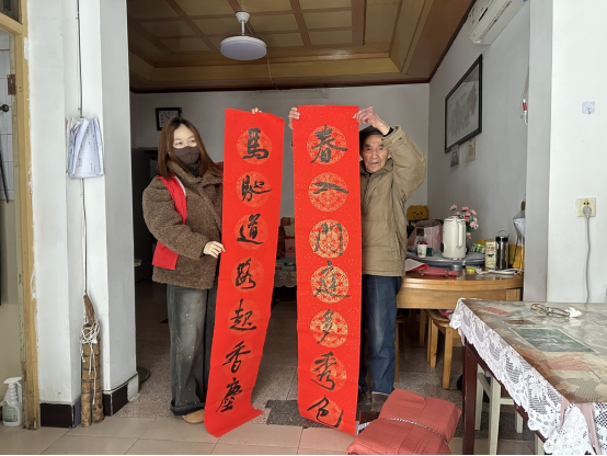随后,社区干部带领社区工作者和网格员,分组带着春联和福字,敲响了退伍老兵的家门。“程老,我们给您送春联来啦!祝您新年身体健康,阖家幸福!”在老兵家中,工作人员仔细为他贴上春联,并与他促膝交谈,聆听他讲述当年的军旅故事,关切询问他的身体和生活状况。大爷抚摸着春联上遒劲的字迹,激动地说:“这手写的春联好啊!看着就亲切、提气!谢谢社区年年都记得我们这些老同志。”
