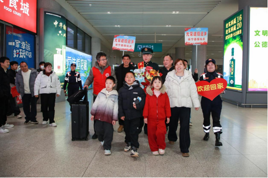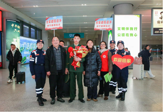 “老兵您好,一路辛苦,欢迎回家!”随着高铁到站,光荣退役返乡的退役军人陆续来到出站口,工作人员和志愿者们主动上前,热情地接下退役军人的行囊,为他们披上喜庆的光荣绶带,送上鲜花。退役军人们瞬间被包围在热烈的掌声、真挚的问候中,现场氛围热烈浓厚。随后,工作人员还给他们送上光荣返乡“政策礼包”,耐心解读相关优抚政策,详细介绍返乡报到流程,并加入了微信群。满满的仪式感和尊崇感让返乡的退役军人缓解疲惫、倍感温暖。现场暖意融融、仪式感十足,温馨的场景也深深打动了过往旅客,大家纷纷驻足拍照和点赞。
