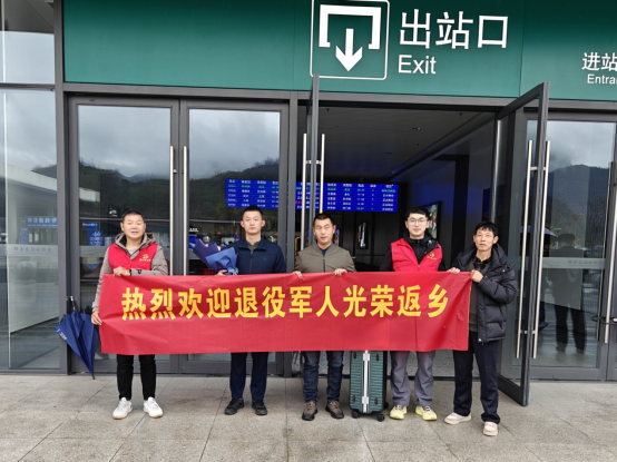 3月1日,黟县宏村镇退役军人服务站携手退役军人家属,专程前往黟县高铁东站,热烈迎接光荣退役返乡的退役军人方铖。
