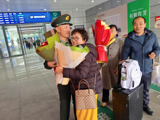 当退役军人身着戎装、身姿挺拔地走出出站口时,现场响起了热烈的掌声。“兵支书”作为“老班长”,第一时间迎上前去,紧紧握住退役军人的手,致以亲切的问候。退役军人父母和亲属也快步上前,将精心准备的鲜花送到孩子手中,一家人深情相拥,场面感人至深。这一刻,尊崇与荣光不仅在横幅上,更在每一个人的笑容与泪光中。