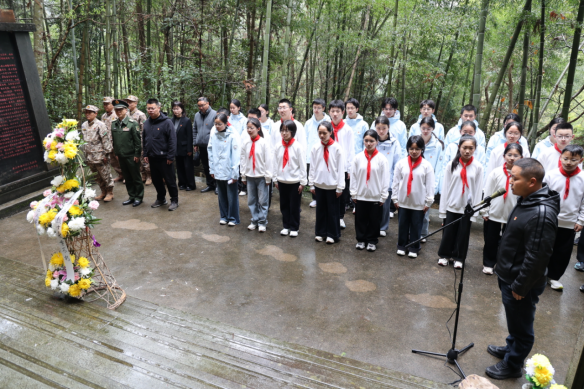上午9时许,祭扫仪式正式开始。全体人员整齐列队,面向烈士纪念碑肃立。伴随着雄壮高亢的旋律,现场奏唱中华人民共和国国歌,激昂的歌声在静谧的山间回荡,表达了大家对祖国的无限热爱和对革命先烈的崇高敬意。