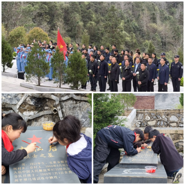 在烈士集中安葬墓区,大家手持扫把、抹布等工具,分工协作清扫墓区步道、清理周边落叶。同学们认真擦拭烈士墓碑、为碑文描红补色,以细致行动守护英烈安息之地,用真心真情表达深切缅怀。