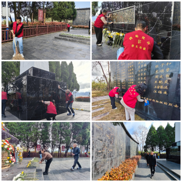 仪式结束后,党员干部手持扫帚、抹布等工具,细心清扫广场落叶杂草,仔细擦拭碑身灰尘,以实际行动维护烈士纪念设施庄严肃穆的环境,用心守护英烈安息之地。