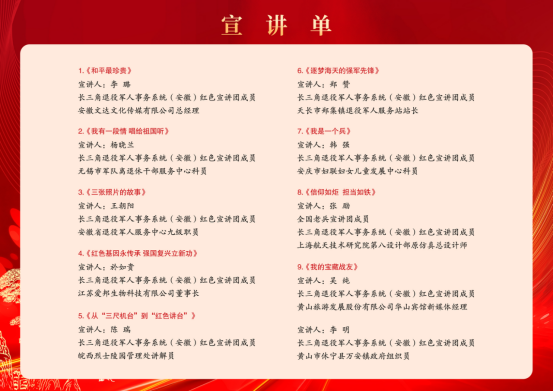 据了解,长三角退役军人事务系统(安徽)红色宣讲团是由安徽省退役军人事务厅牵头,依托各级退役军人服务中心(站)组建的一支专业宣讲团,宣讲团成员由退役军人中的功臣模范、参战参试老兵、英烈讲解员、军队离退休干部、“兵支书”、“军创企业家”等先进典型组成。
