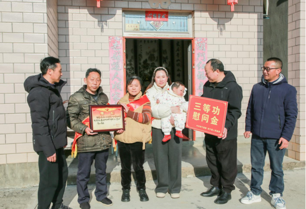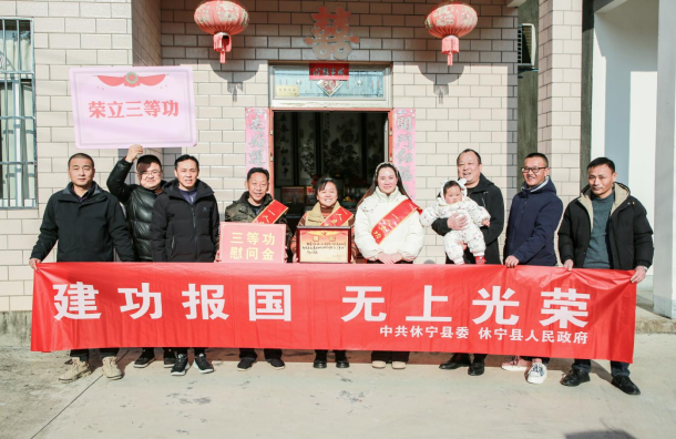 “噼里啪啦,噼里啪啦。”喜庆的氛围让小山村显得格外热闹,喜气洋洋。12月30日上午,在热闹的鞭炮声中,休宁县人武部、县退役军人事务局和源芳乡相关负责同志一齐来到源芳乡源芳村,为荣立三等功的现役军人杨晨家人送上一份特殊的“节日大礼”三等功喜报和慰问金,为元旦喜庆氛围增添了一道荣耀之光。