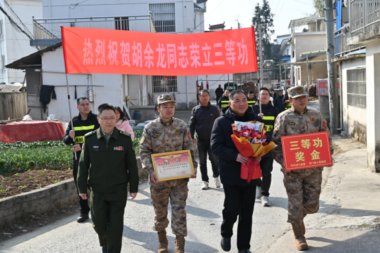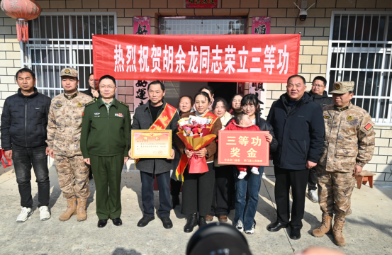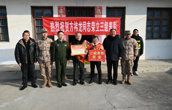 1月23日上午,县人武部部长卢程率队为荣获先进老干部工作者称号的军人方祎龙和荣立三等功的军人胡余龙的家庭送去立功受奖喜报。