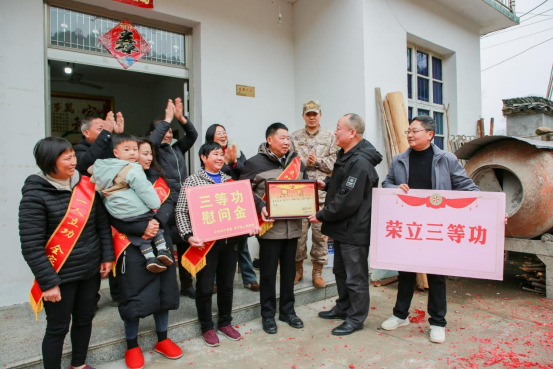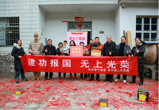 “恭喜!恭喜!”在周跃辉家中,伴随着喜庆震耳的鞭炮声,休宁县人武部、县退役军人事务局负责人,为其家人披上绶带,颁发立功喜报,送上慰问金,感谢周跃辉为部队建设作出贡献、为家乡赢得荣誉,也感谢周跃辉家人对国防事业的大力支持。