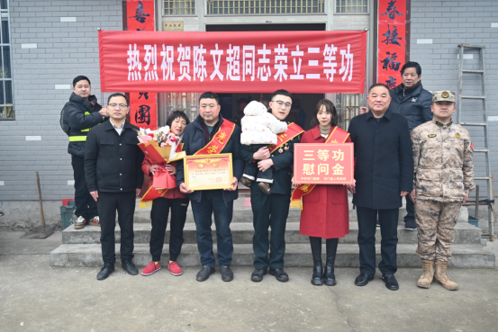 在闪里镇陈文超家中,送喜报队伍敲锣打鼓、高举横幅、手捧喜报,邻里乡亲纷纷驻足喝彩。送喜报小组为军属佩戴“一人立功、全家光荣”绶带,送上立功喜报、慰问金和鲜花,并与军属亲切交谈,详细了解家庭生活情况,感谢他们为国防事业培养优秀人才。陈文超父亲激动地说:“儿子在部队立功,是我们全家的骄傲!小年收到这份特殊礼物,比啥都暖心。”